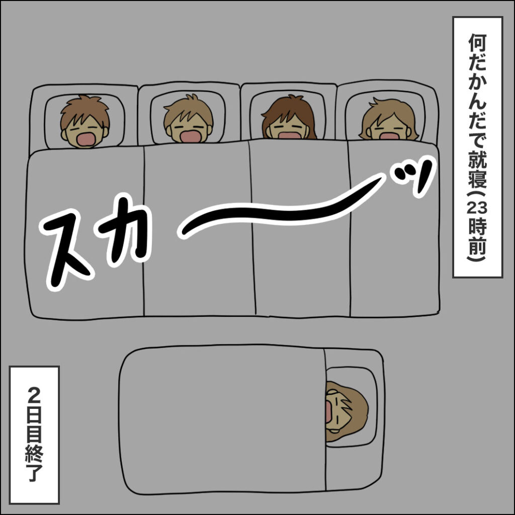 そしてこの日も、23時前には全員バッテリー切れ(爆睡)